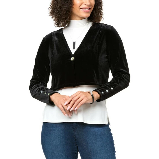 Whether it’s a day at the office or the annual holiday party, you’ll be extra warm and extra stylish in this soft, velvet cropped cardigan.