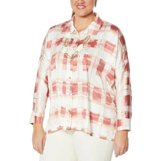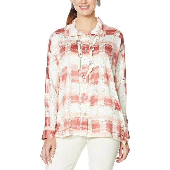 No longer a uniform for lumberjacks and school girls, plaid is making a play for your everyday style. A pretty painted plaid print on textured satin fabric and chiffon trim adds an elegant touch to your fall and winter wardrobe. This classic button-front shirt from WynneLayers can be layered over another top (or even a dress)and left unbuttoned for a casual-cute look, or worn buttoned up and tucked in for a more sophisticated take.