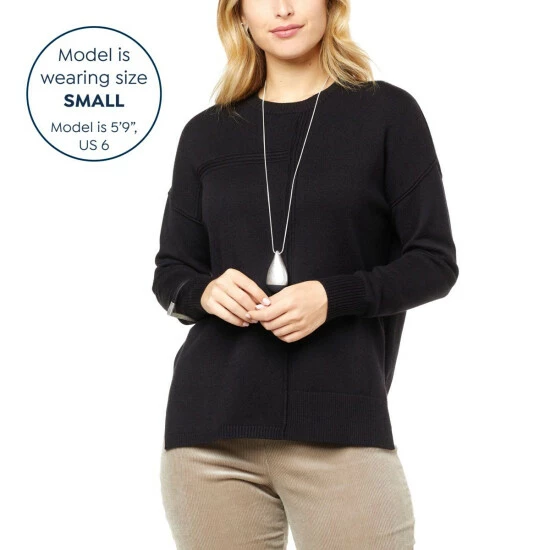 | Fabrication: | SoftKNITsweater knit with external horizontal and vertical seaming patterns |