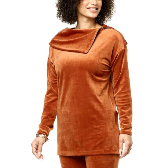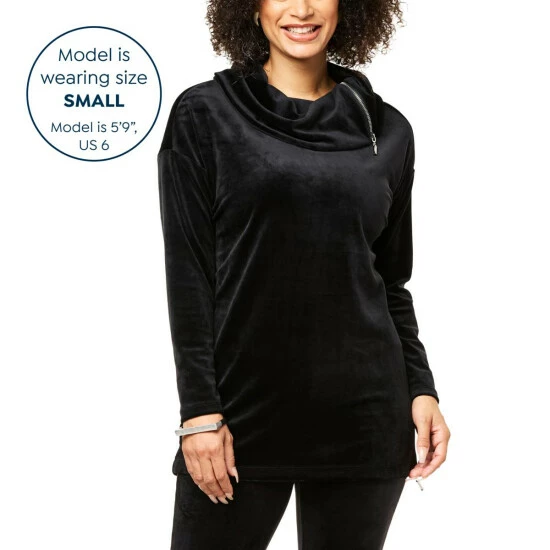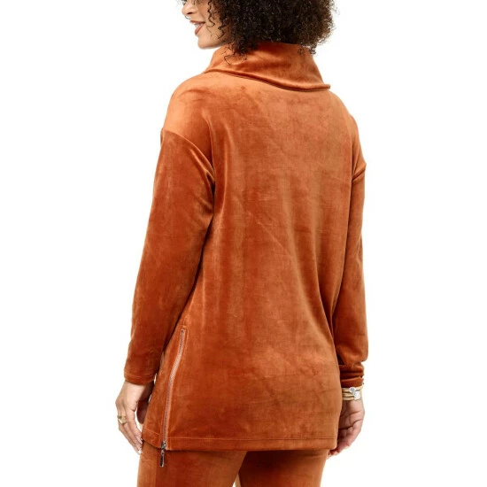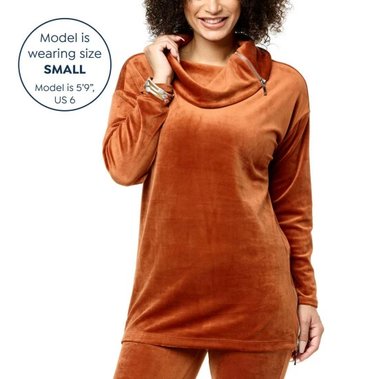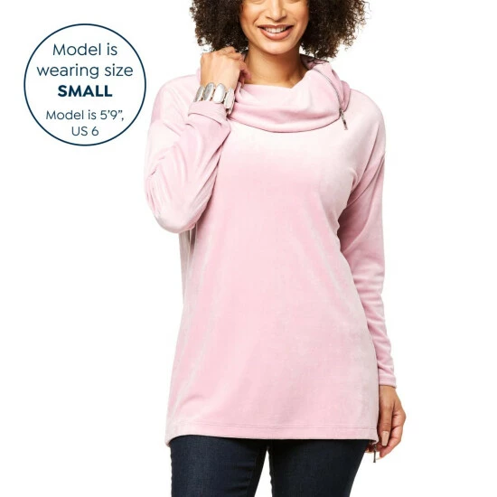 Soft velour fabric and a large cowl neck add extra coziness to this long-sleeve tunic, with zipper details that allow for a slightly looser fit.