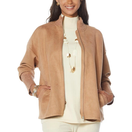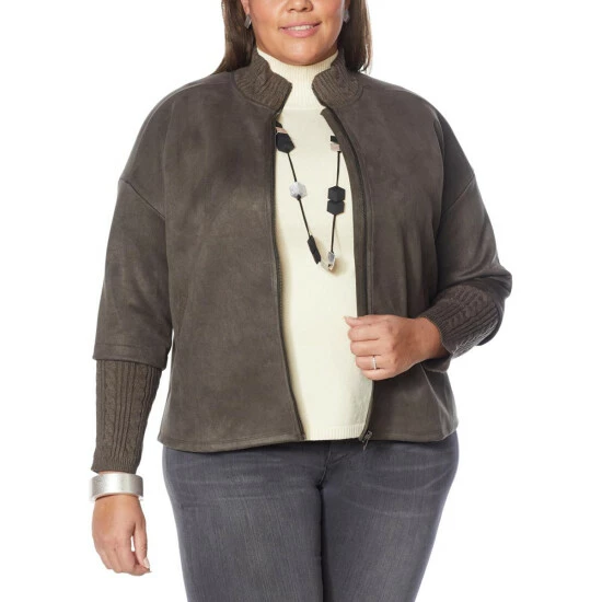 MarlaWynne Faux Suede Bomber Jacket with Sweater Knit Trim