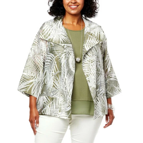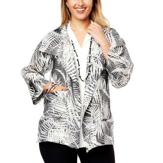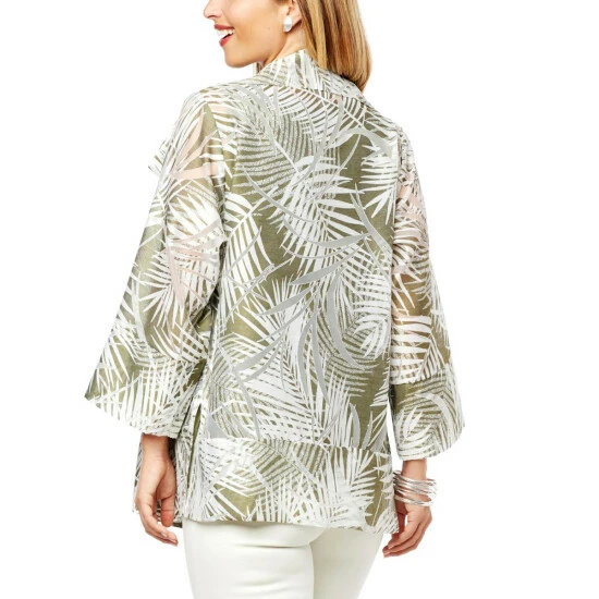 A touch of tropical style that can be worn year-round. This palm leaf-printed novelty topper jacket is stylish, comfortable and convenient, featuring two front patch pockets.