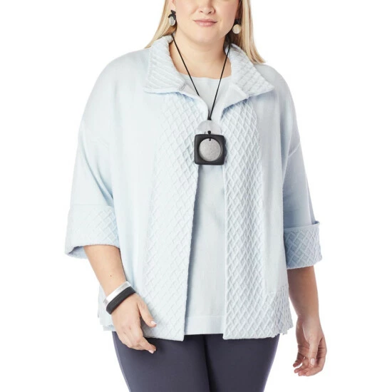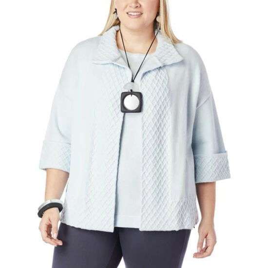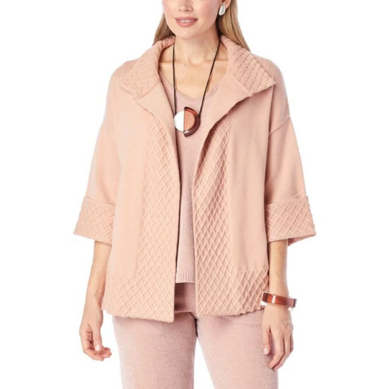 This sweater-knit cardigan topper with cross-stitch detail at the sleeves and hem proves that it’s possible to be warm, comfortable, and stylish all at the same time.