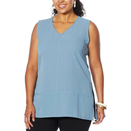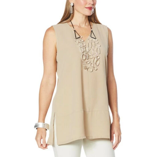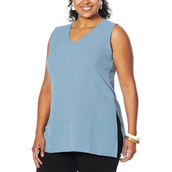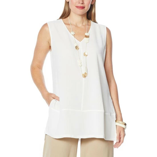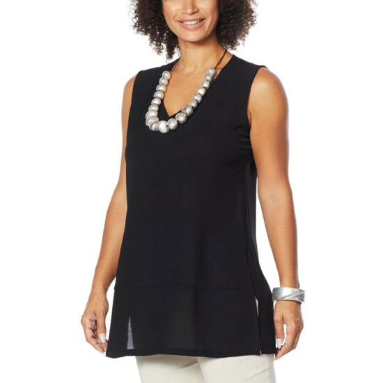 Floaty washed crepe fabric and a longer tunic length give this sleeveless frock a versatile designthat can go from business casual to dinner diva with asimple change of shoes and accessories.