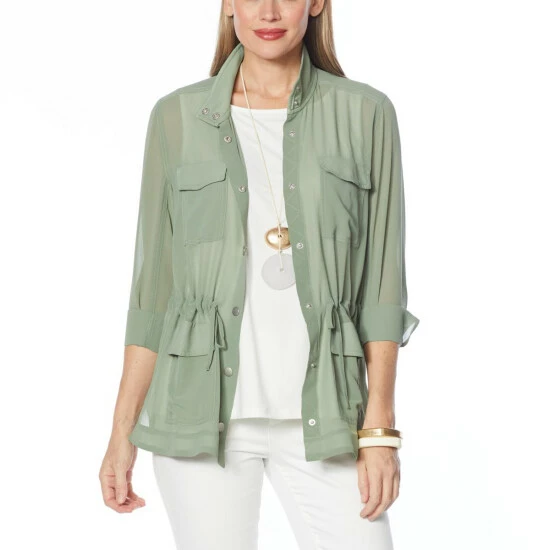 We love the stylish contradiction of this casual, safari jacket-inspired silhouette crafted out of sheer chiffon fabric. It’s the perfect lightweight topper for everything from dresses and denim to skirts and shorts.