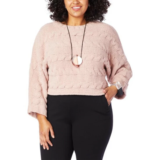 Cozy, comfy, and warm – that’s the perfect way to describe this popover sweater from WynneLayers. Cable-knit, plush fabric, voluminous batwing sleeves, and a cropped fit make it perfect for layering.