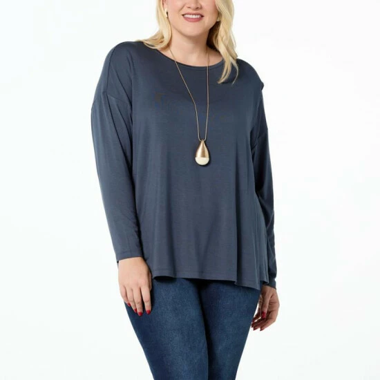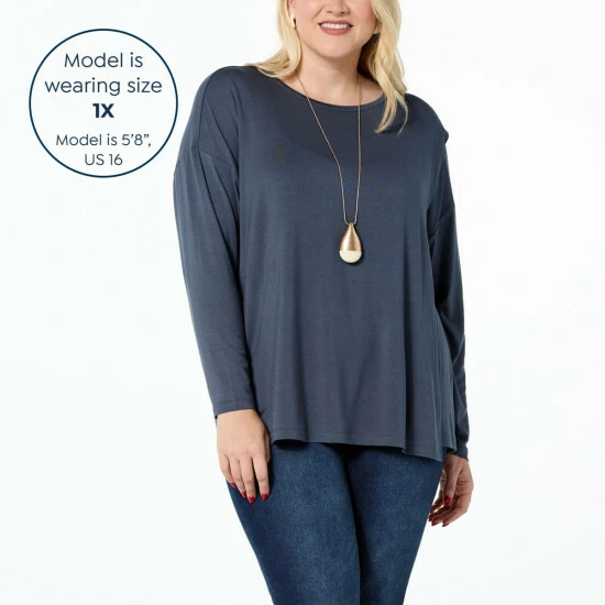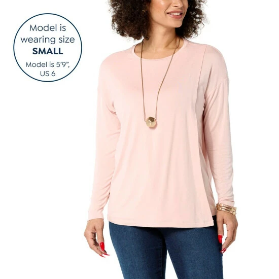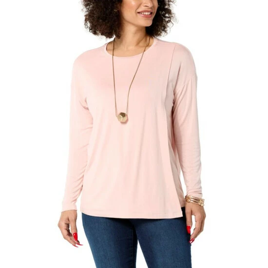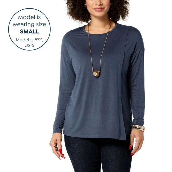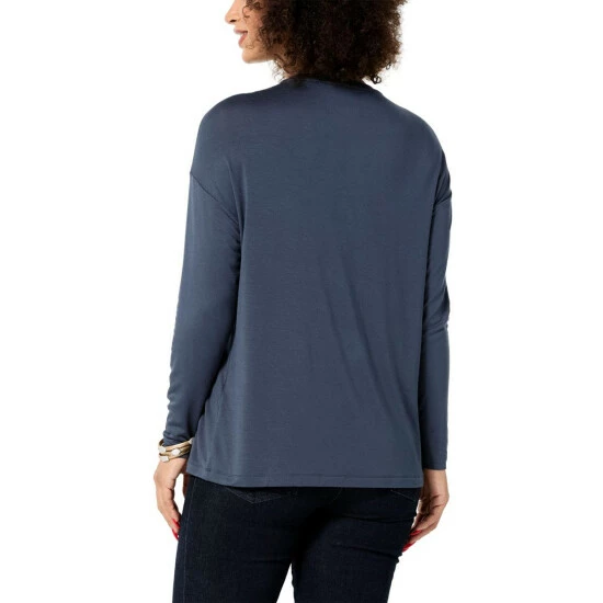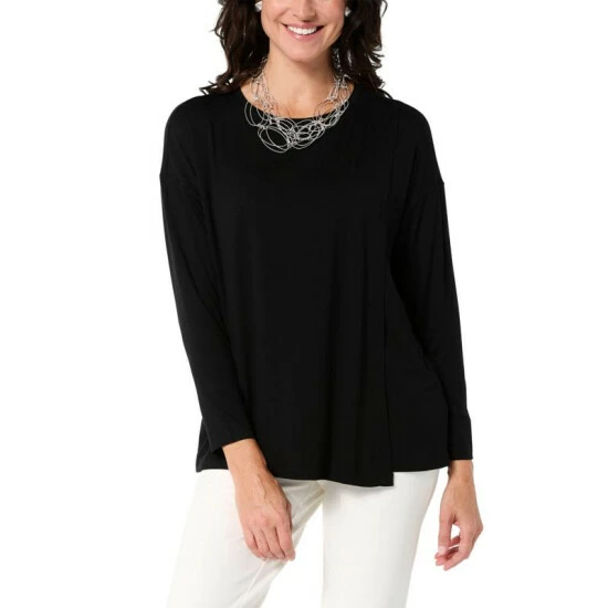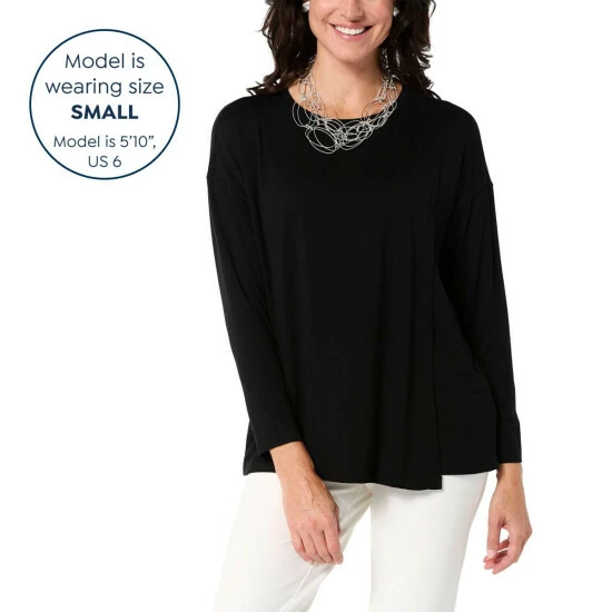Trendy, yet timeless. This chic long-sleeve tee features soft jersey knit and an overlap detail that adds stylish sophistication to your everyday wardrobe.