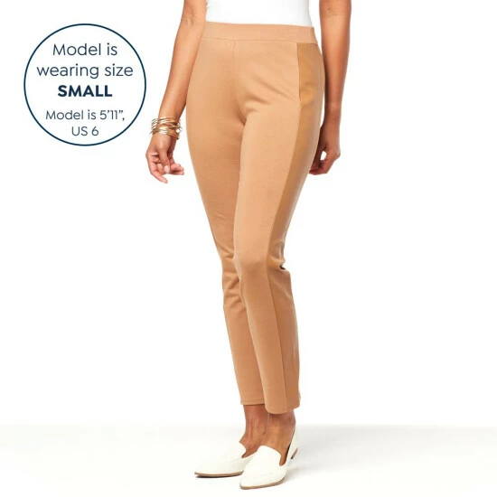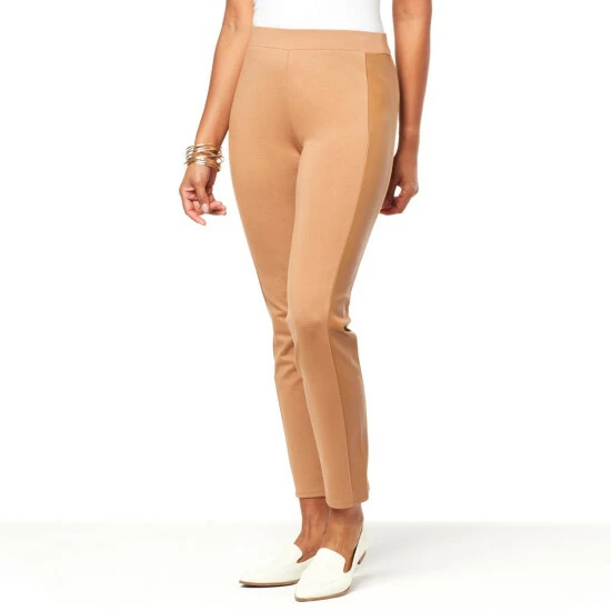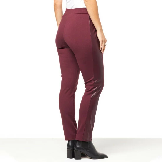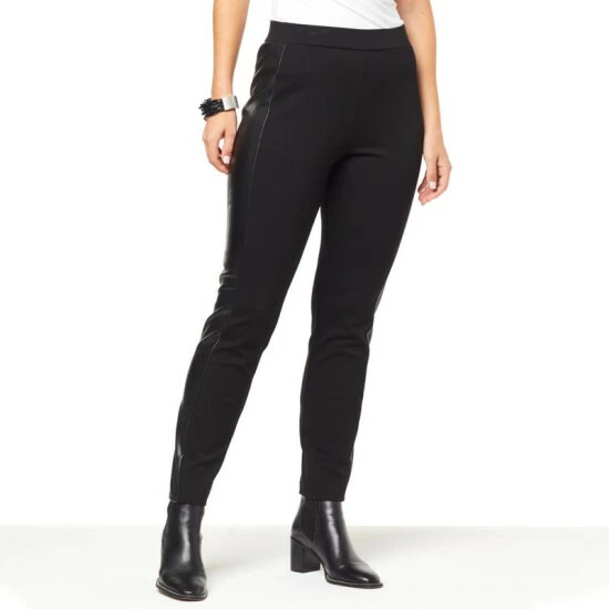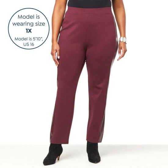 Professional style with a little bit of edge.Super-soft double knit, an easy pull-on silhouette, faux leather side panels and straight-fitting legs give it timeless, figure-flattering appeal for any time of year.