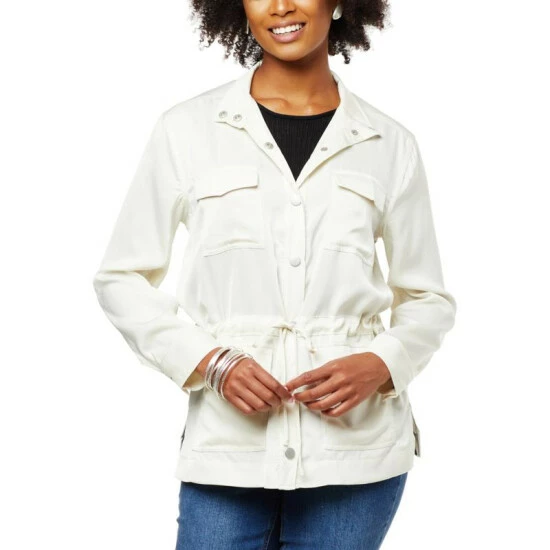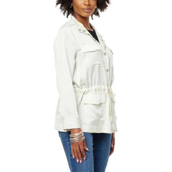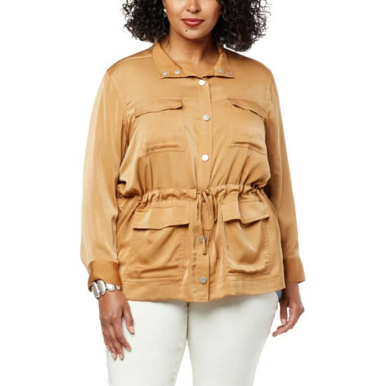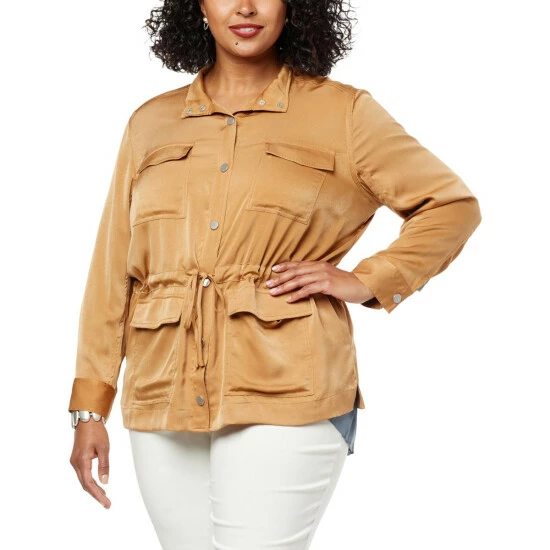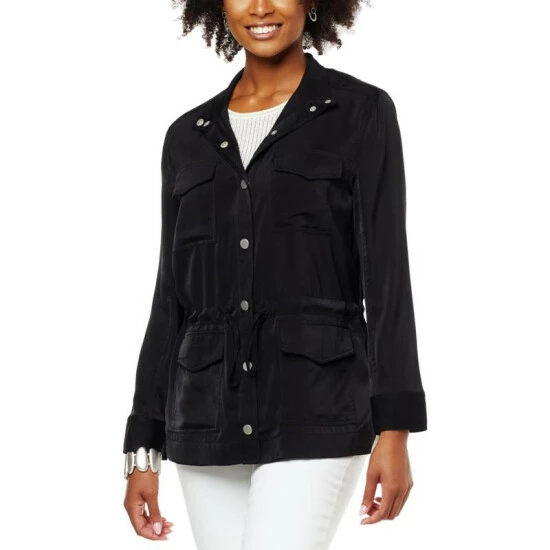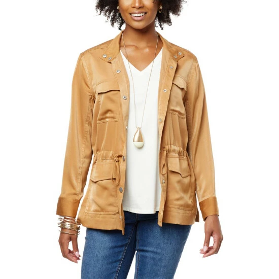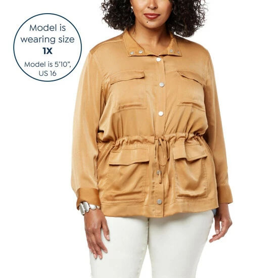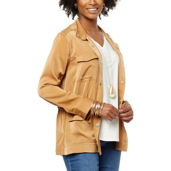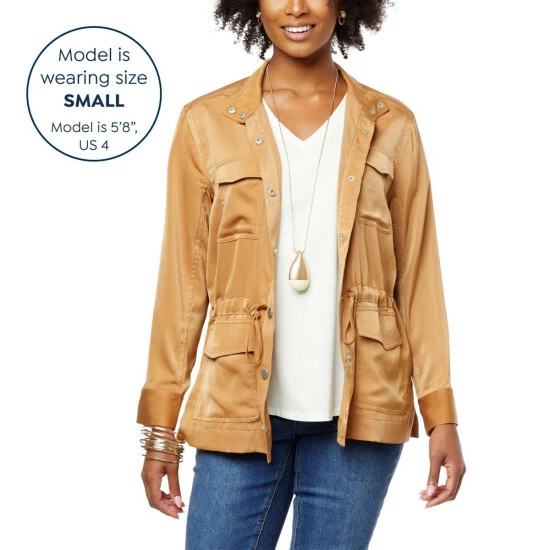 We love the stylish contradiction of this casual,utility jacket-inspired silhouette crafted out of matte satin fabric with a peplum finish. It’s the perfect warm-weather topper for everything from dresses and denim to skirts and shorts.