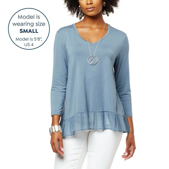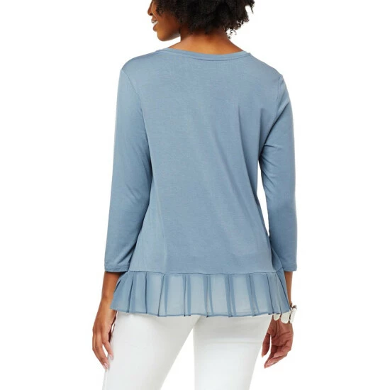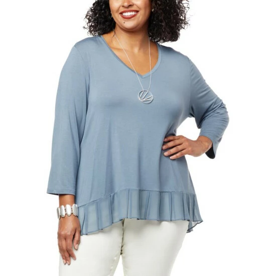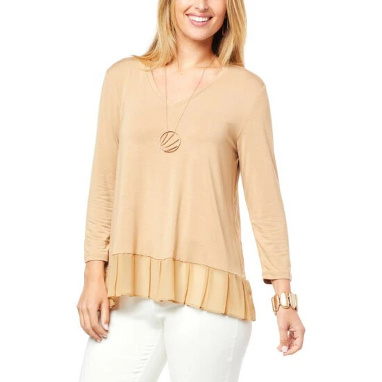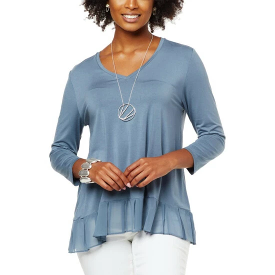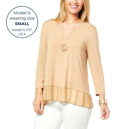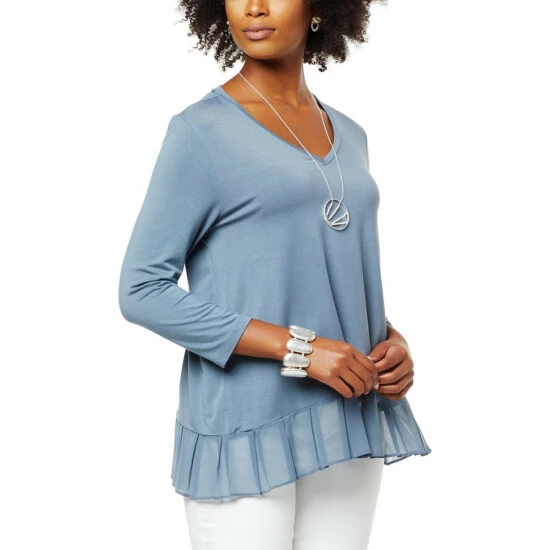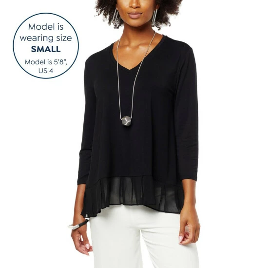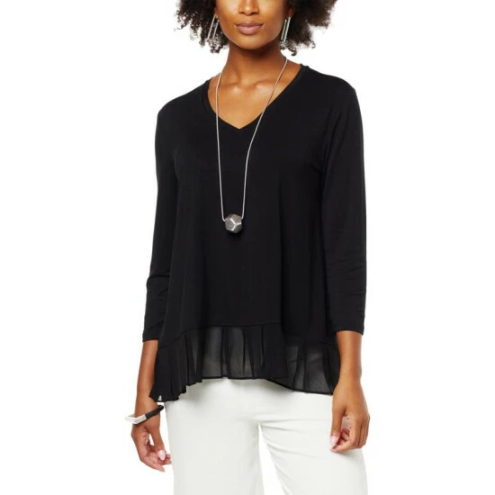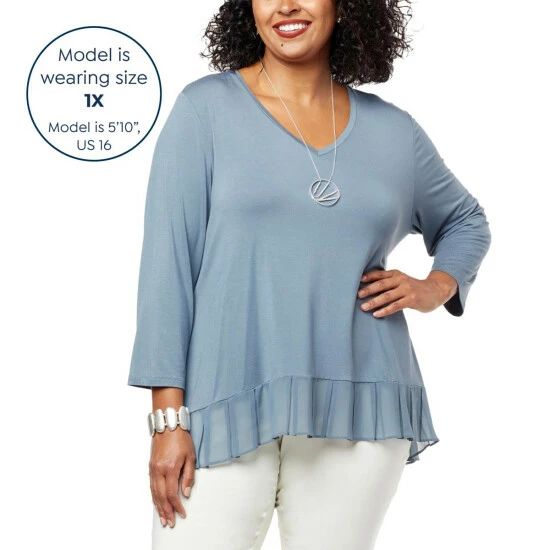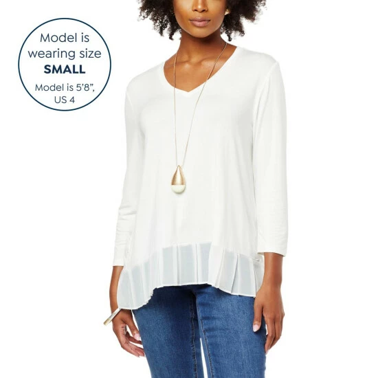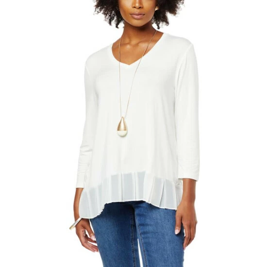 Build a timeless wardrobe with stylish foundation pieces like this mixed mediatop from WynneLayers. A classic V-neck and chiffon pleated hem give this 3/4 sleeve pullover a unique flair.
