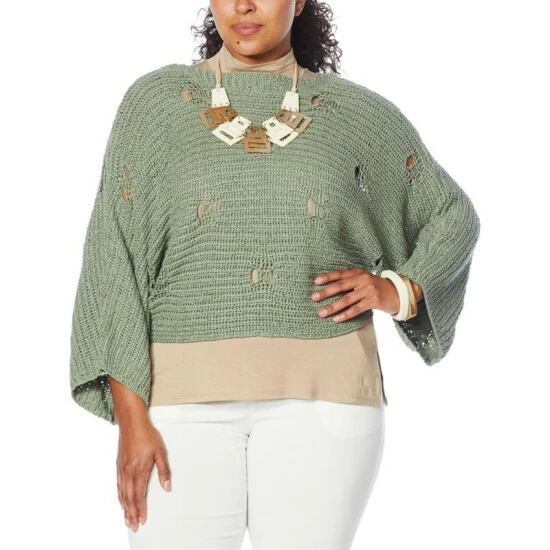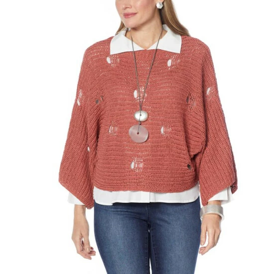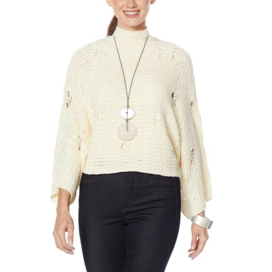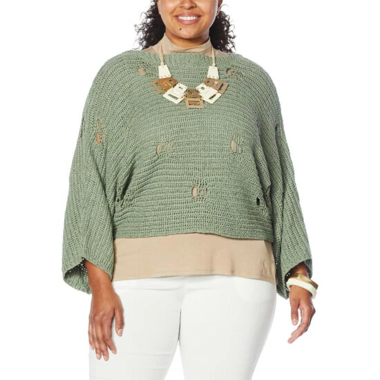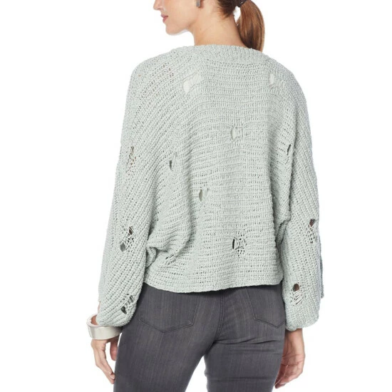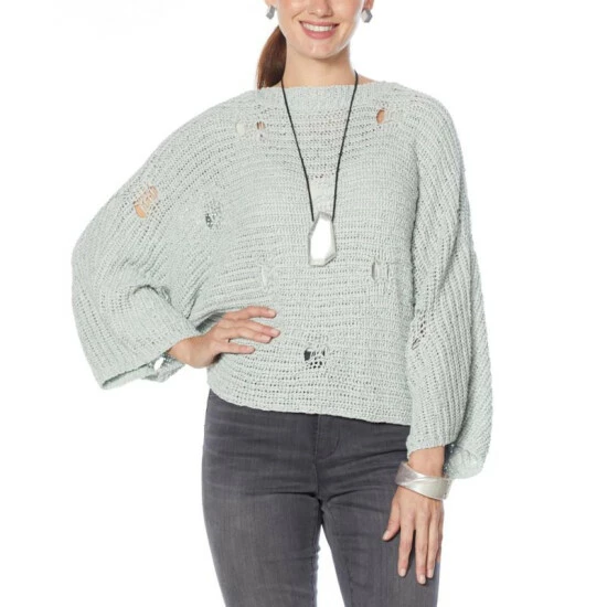 We love the versatility of this softsweaterknit popover from WynneLayers. Voluminous batwingsleeves, chic distressed-look drop needle stitchingand a slightly cropped silhouette give it endless layering opportunities.