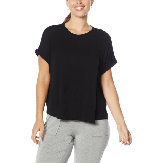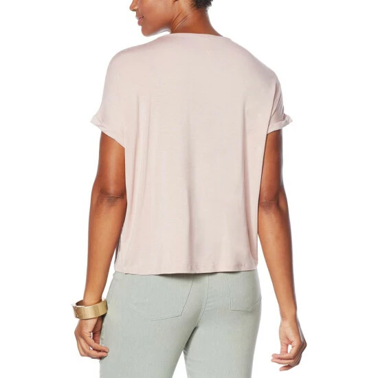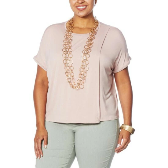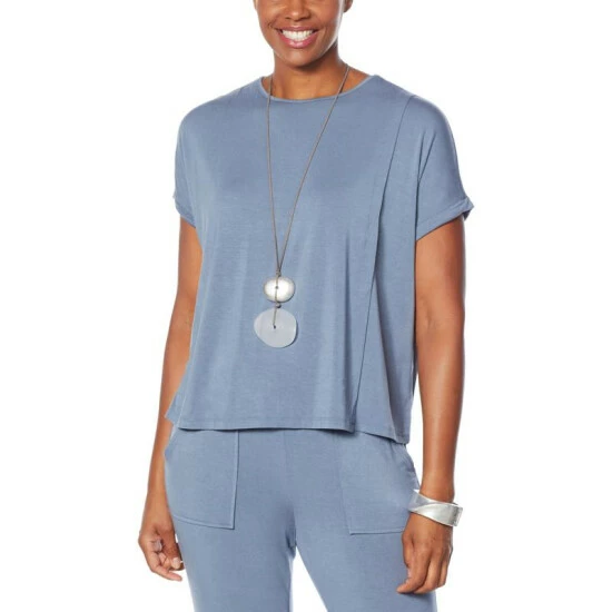 Update your basics! A roomy, pullover t-shirt silhouettewith an overlapping front paneladds standout style to this classic, jerseyknit top.