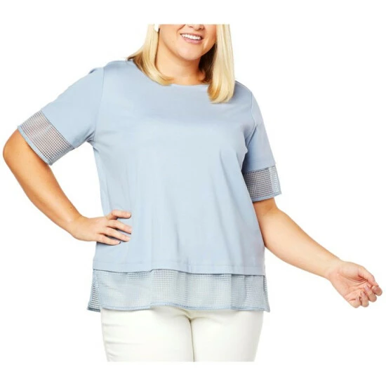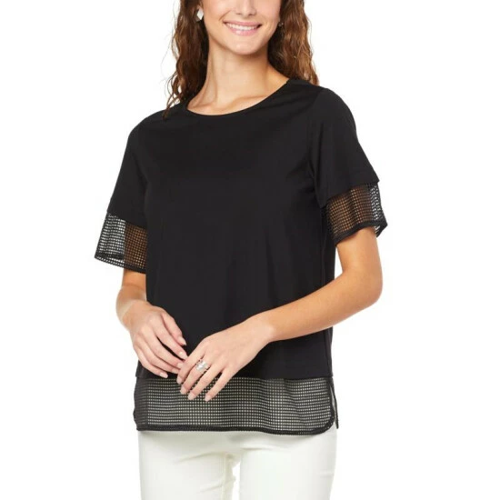 Build a timeless wardrobe with stylish foundation pieces like this mixed mediatop from WynneLayers. A classiccrew neckline and mesh trim give thisshort-sleeve pullover a unique flair.