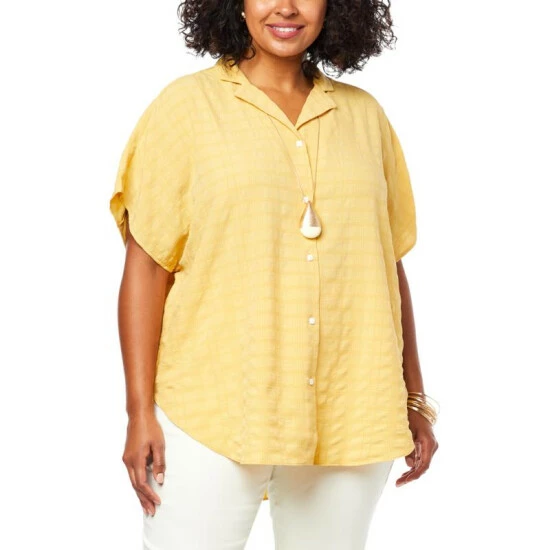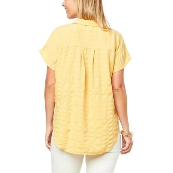 Crafted from soft, light stretch pucker plaidfabric, this upgraded essential features a comfortable, loose shape,shortsleeves and a button-front closure for a beautifully versatile workday-to-weekend look.