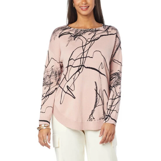 Add a little bit of fun to your cool weather wardrobe! This curved hem, scribble-printed sweater goes perfectly over a pair of skinny jeans or leggings. Add some boots and you’re ready to go!