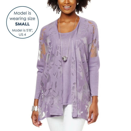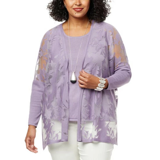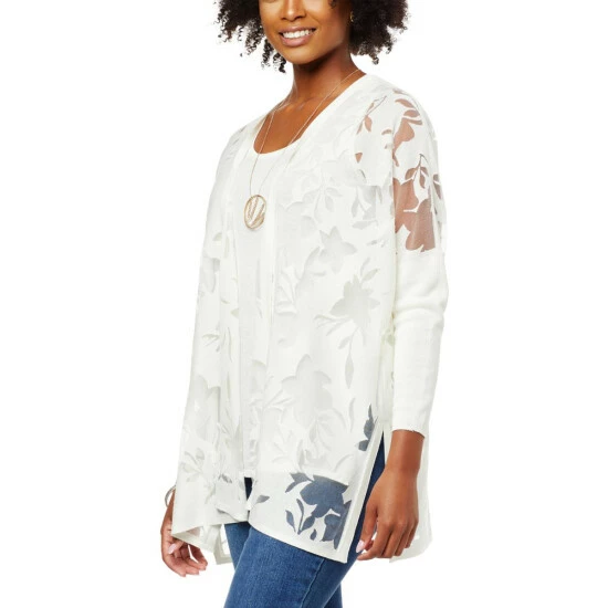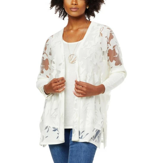Sheer fabric with a pretty burnout floral pattern updates this classic 3/4 sleeve topper withsuperior style.