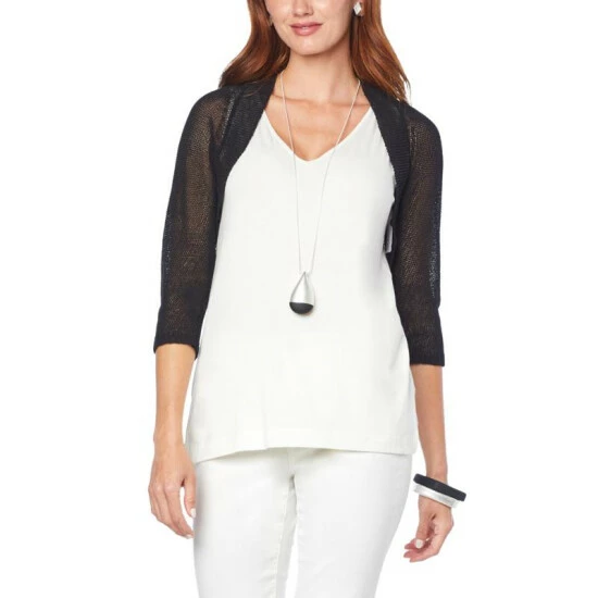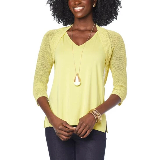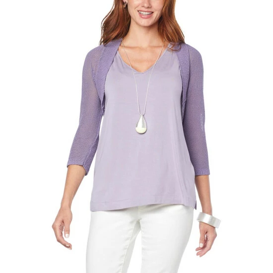 Add a lightweight layer to your warm-weather looks with this3/4-sleeve bolero shrug sweater from WynneLayers. The softness of a sweater without the extraheat.