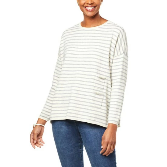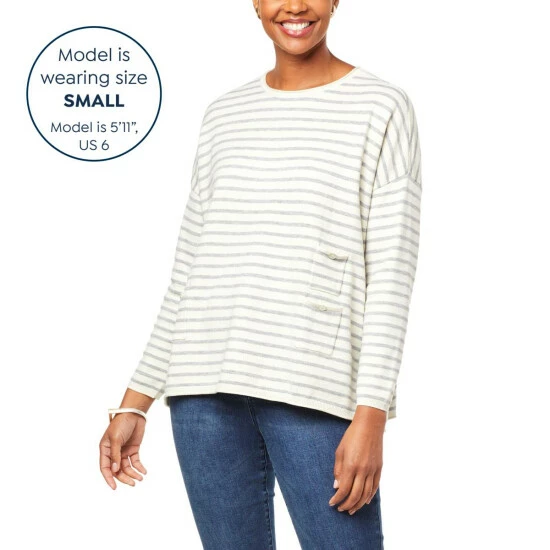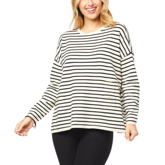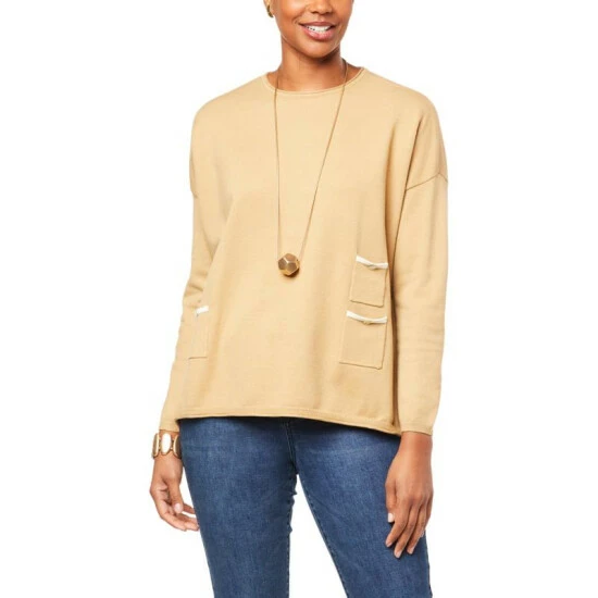 Who said three’s a crowd?Thissoft knit, cozysweater features a crew neckand a boxy silhouette with not one, not two, but three pockets for extra functionality and style.