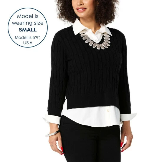 Build a timeless wardrobe with stylish foundation pieces like this mixed media sweater from WynneLayers. A knit fabric shirt collar, cuffs and hemline give this 3/4 sleeve, cable knit sweater a unique flair.