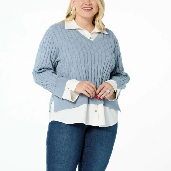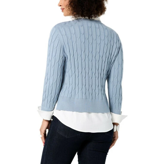 WynneLayers SoftKNIT Mixed Media Cable Sweater with Shirt Collar