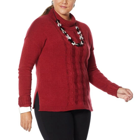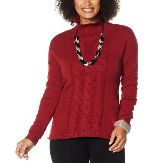 Cable knit and open ladder-stitch patterns add texture and dimension to this classic pullover sweater. With a wide, ribbed knit turtleneck and extra-wide cuffs that can be rolled andfolded over, it’s a stylish way to update your cold-weather wears.