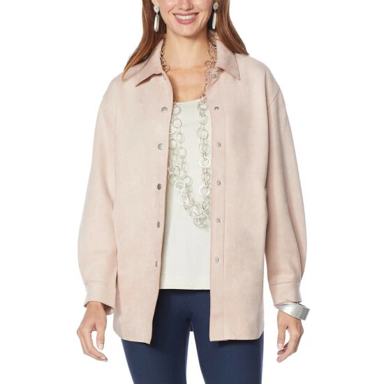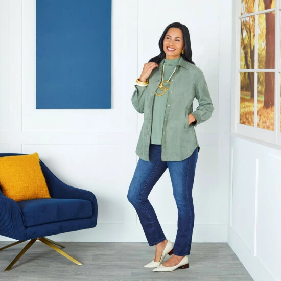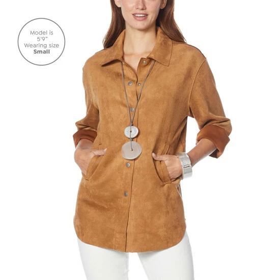 Get thelook and feel of suede without the weight (or hefty price tag). WynneLayers woven faux suede fabric is lightweight and completely luxurious in this versatile shirt jacket.