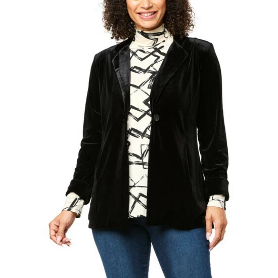 Who doesn’t love the smooth, silky look and feel of velvet?With two pockets and a single-button closure, this long-sleeve blazer is a sophisticated, stylish finishing touch to any evening’s outfit.